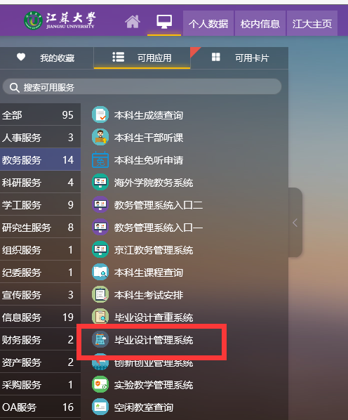 登录酷爱成人网 综合门户,在“可用应用”菜单下-》“教务服务”-》“毕业设计管理系统”或者在搜索中输入“毕业设计管理系统”关键字。毕设系统不需要登录vpn,如已登录了vpn,请先退出再访问。为保证使用效果,推荐使用360浏览器。