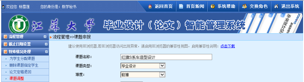 调整完毕,点击修改,待毕设专业审核人(在特殊情况处理-》任务书修改审批)审核通过后,新任务书生效。
