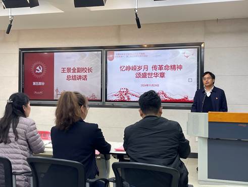 王景全副校长最后作总结讲话。他指出,在当前国际形势复杂多变的背景下,青年人要担负起民族复兴的重任,将个人的发展同国家、社会和学校的发展结合在一起,树立科技报国的理想,苦练内功,积极应对各种困难挑战。同时,他对学生党员提出三点期望:一是要做传承革命精神的先锋队,讲好红色故事,赓续红色血脉;二是要做服务社会、服务同学的生力军,用实际行动践行党员初心使命;三是要做团结协作领头雁,发挥好党支部的战斗堡垒作用和党员的先锋模范作用,汇聚成团结奋斗的强大力量。