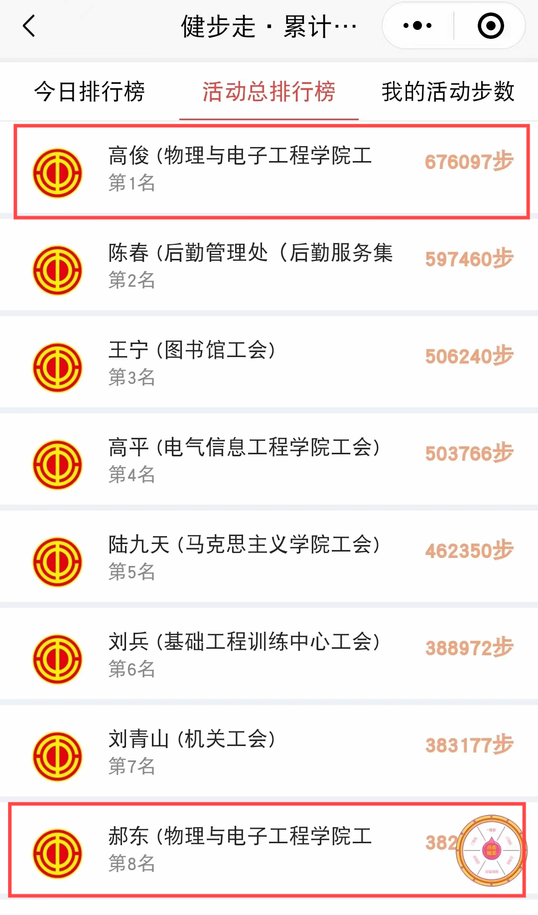 活动期间,学院教职工们踊跃报名,热情参与。其中,高俊老师以60多万步的成绩位列健步走活动第一名,郝东老师名列第八名,学院有40%以上老师达标。