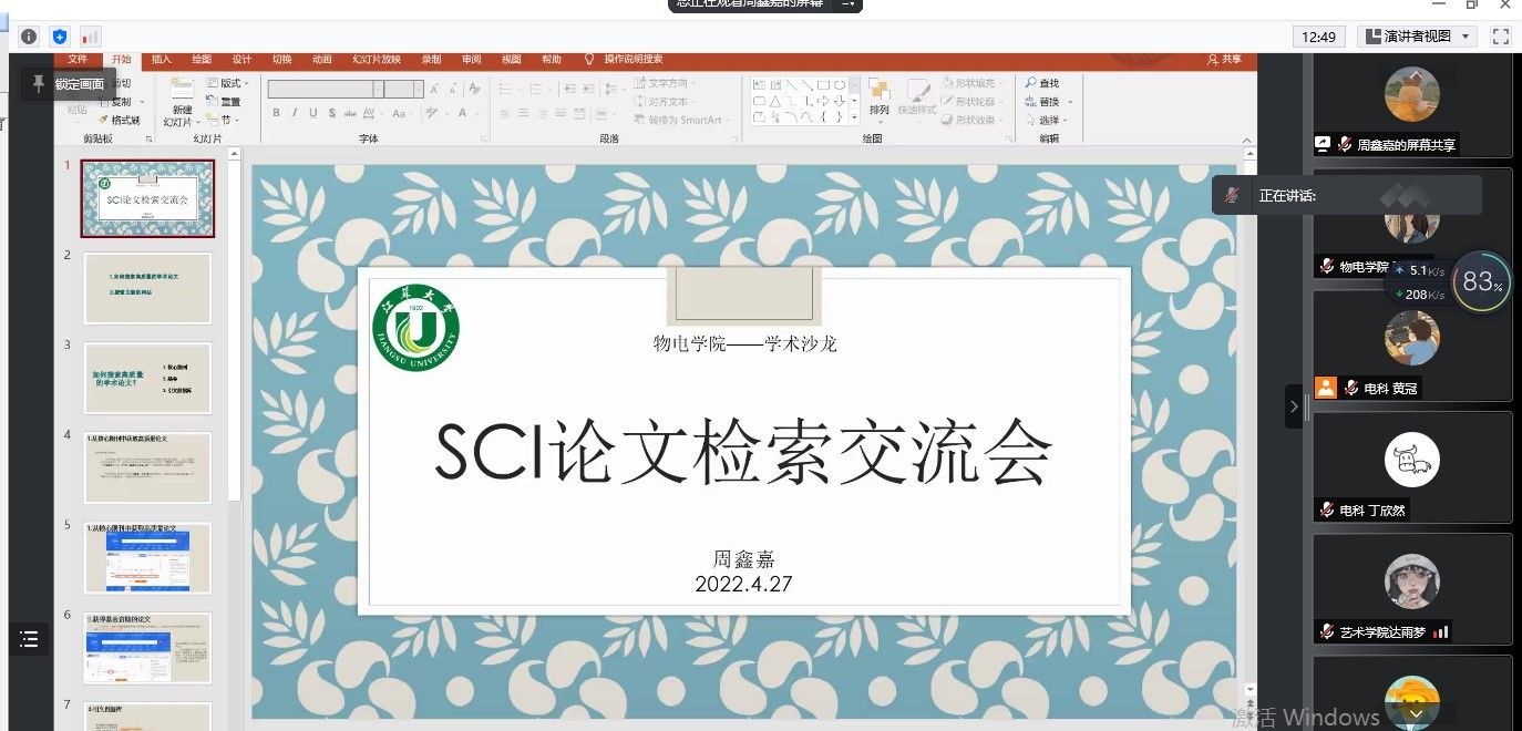 周鑫佳同学指出:研究生需要及时搜索近期的高质量文献,了解最新的科研动向和研究内容,结合自己的研究方向,进行整合创新。学会利用网络资源十分重要。接着,周鑫佳同学展示了平时搜索文献的网站和具体搜索步骤。