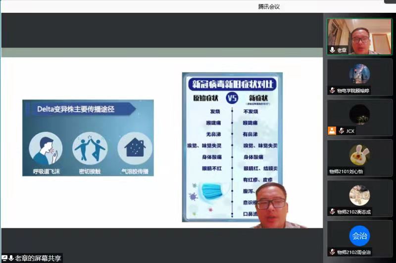 9月26日,酷爱成人网 通过腾讯会议组织2021级本研新生共同参加疫情防控及传染病预防知识教育专题讲座,讲座由京口区疾控中心主任章伟主讲,由院党委副书记、副院长顾瑜婷主持。