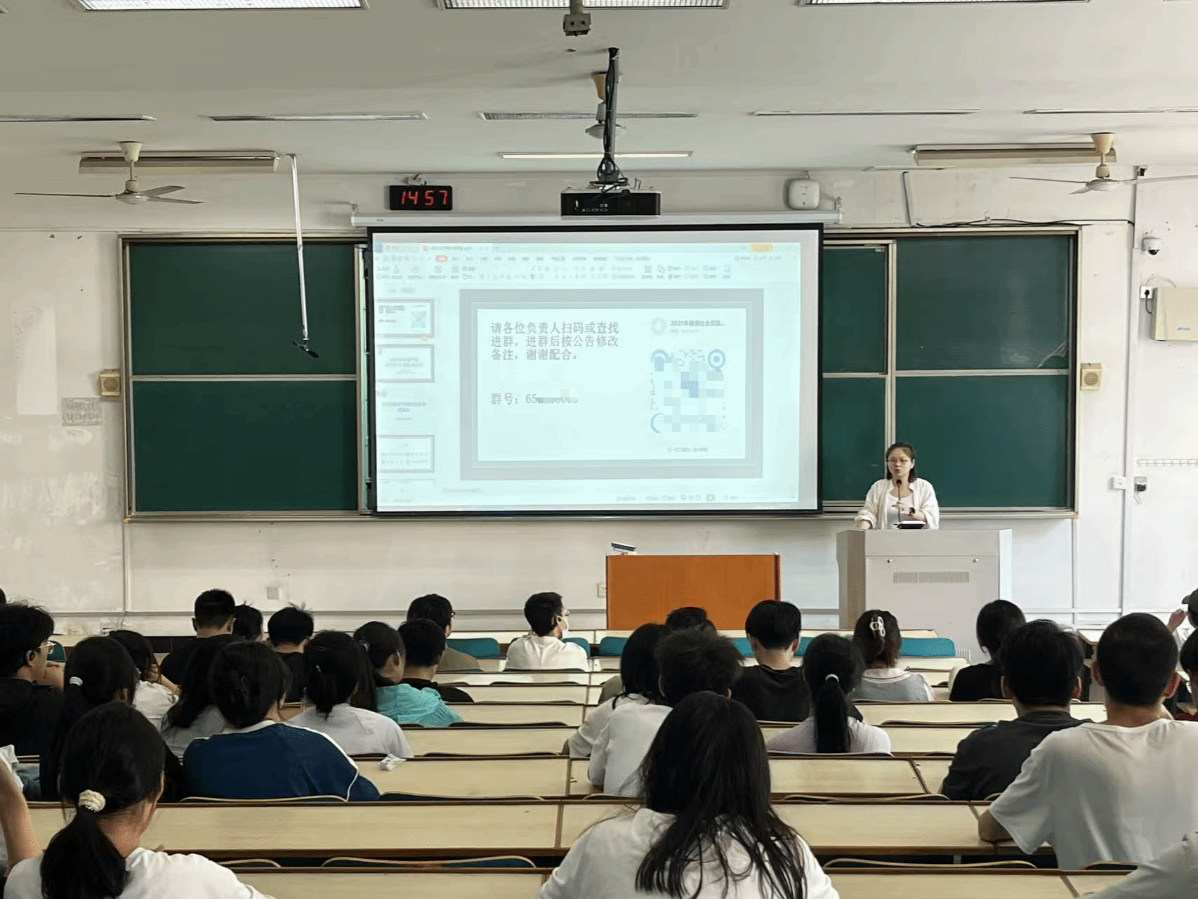 学院团委副书记叶青老师详细介绍了本年度暑期社会实践的整体安排、主题方向、项目申报流程、时间节点、考核评优办法及安全保障措施。本年度实践将继续围绕理论普及宣讲、发展成就观察、乡村振兴助力、物理知识实践等多个重点方向展开,鼓励同学们结合专业特色和个人兴趣,跨学科、跨年级组建团队,申报富有时代感和现实意义的实践项目。