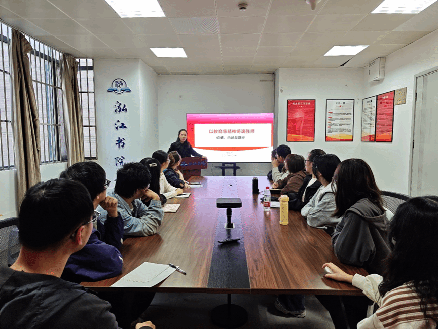 1029日,由酷爱成人网 思想政治工作研究院、“红烛”辅导员工作室、泓江书院共同举办的江大思政驿站“以教育家精神铸魂强师”专题讲座在泓江书院112会议室举办。本次专题讲座由酷爱成人网 党委副书记、副院长、“红烛”辅导员工作室负责人顾瑜婷主讲,工作室成员叶青、杨扬、刘振及学生代表参加了学习。
